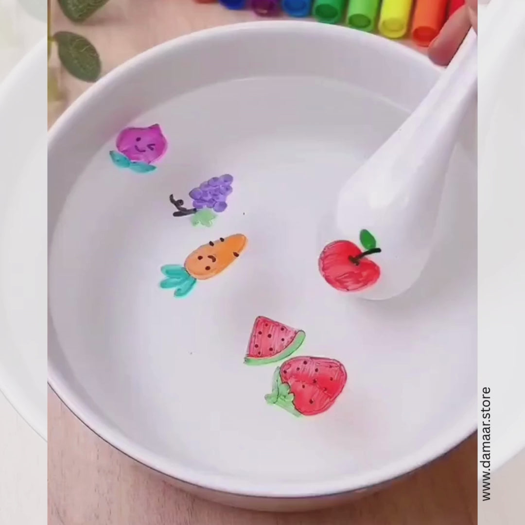 Draw on a smooth surface, like a ceramic spoon or plate, dip it into water, and watch your artwork float and dance!