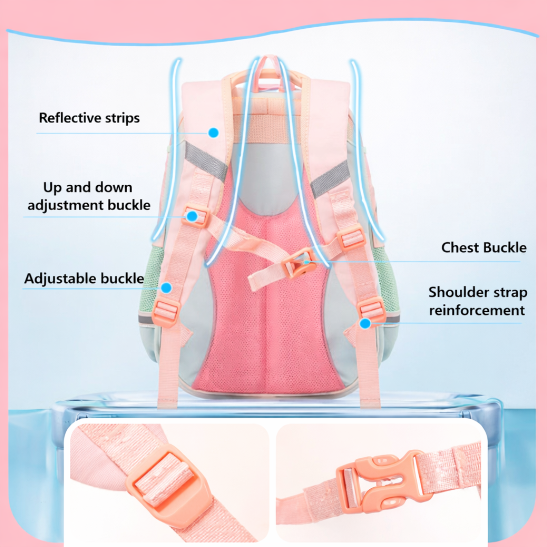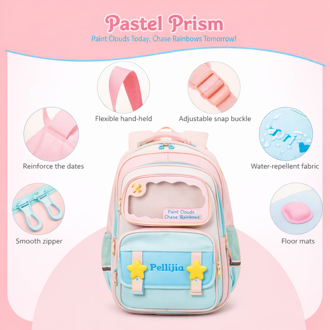 • Cute & Premium Design: Soft pastel pink and blue backpack with star accents and a clear front window for a playful, stylish look.